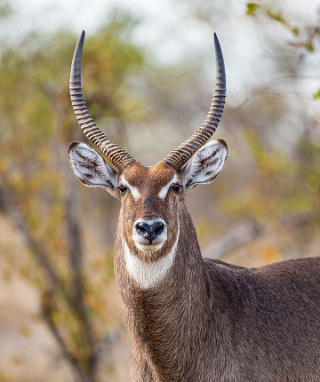 The waterbuck, a robust antelope of Africa’s grasslands and savannahs, is easily recognised by the distinctive white ring on its rump. Preferring habitats near water, it feeds on grasses and relies on its oily, water-resistant coat for protection.