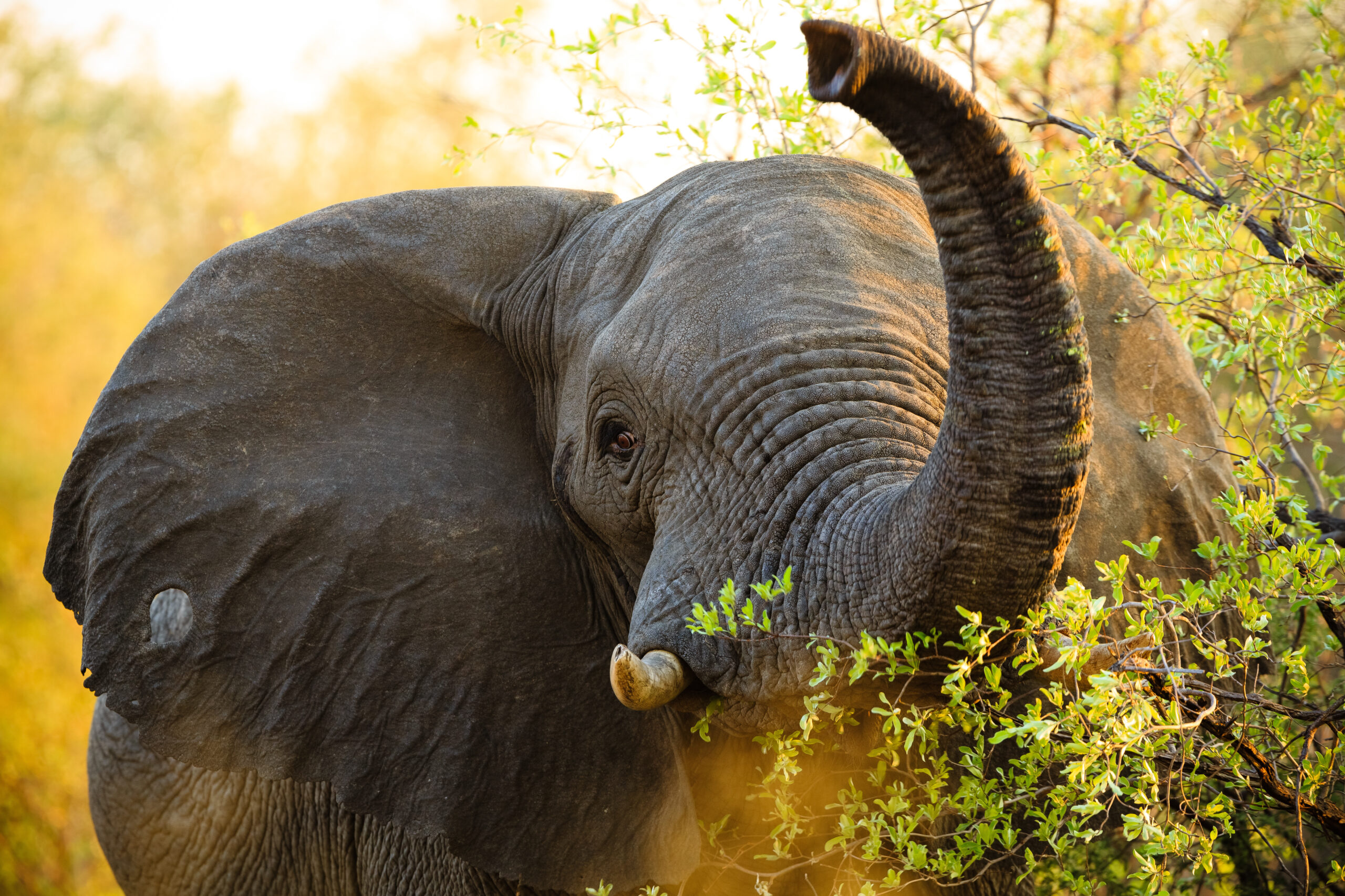 The elephant, the largest land mammal, roams Africa's deserts, savannahs and forests with grace and strength. Known for their intelligence and close family bonds, they use their versatile trunks for feeding, drinking, and communication.