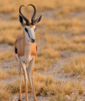 Springboks in Namibia are known for their unique “pronking” behaviour, where they leap up to three metres into the air, possibly to evade predators or display strength. Adapted to the arid environment, they can go long periods without drinking water, relying on moisture from the plants they eat to survive.